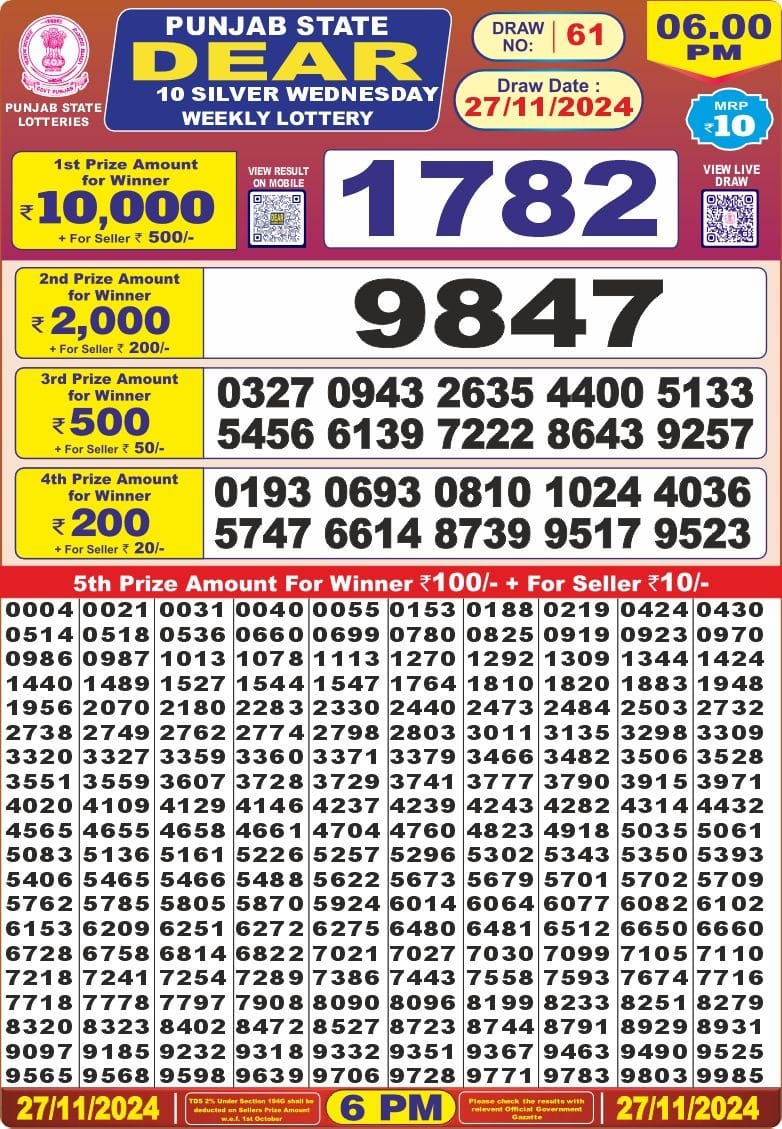 Punjab state dear 10 Silver 6pm lottery result 27.11.24