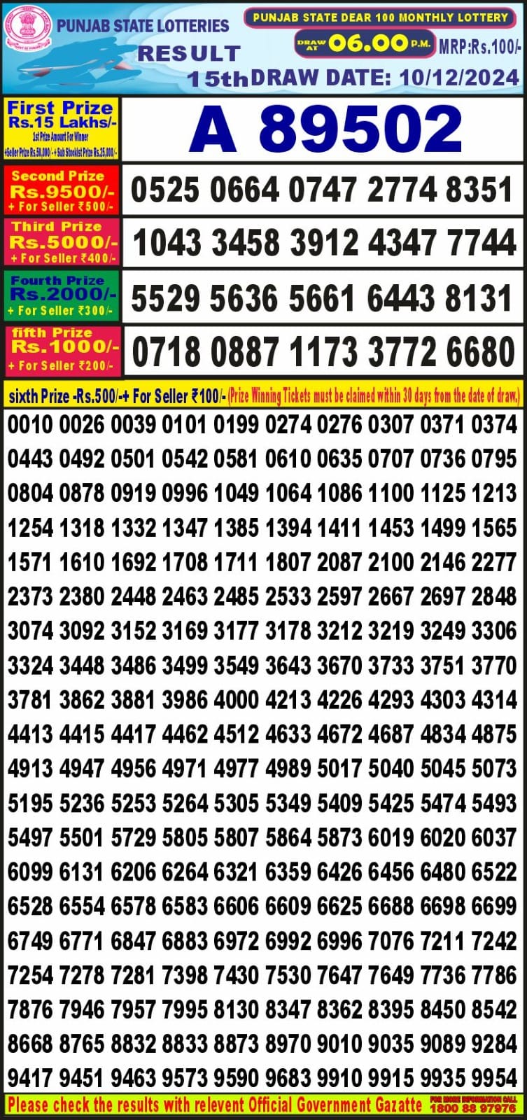 Punjab State Dear 100 Monthly Lottery Result Today 10.12.2024