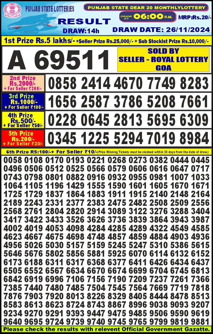 Punjab state dear 20 monthly lottery result 6pm 26.11.2024