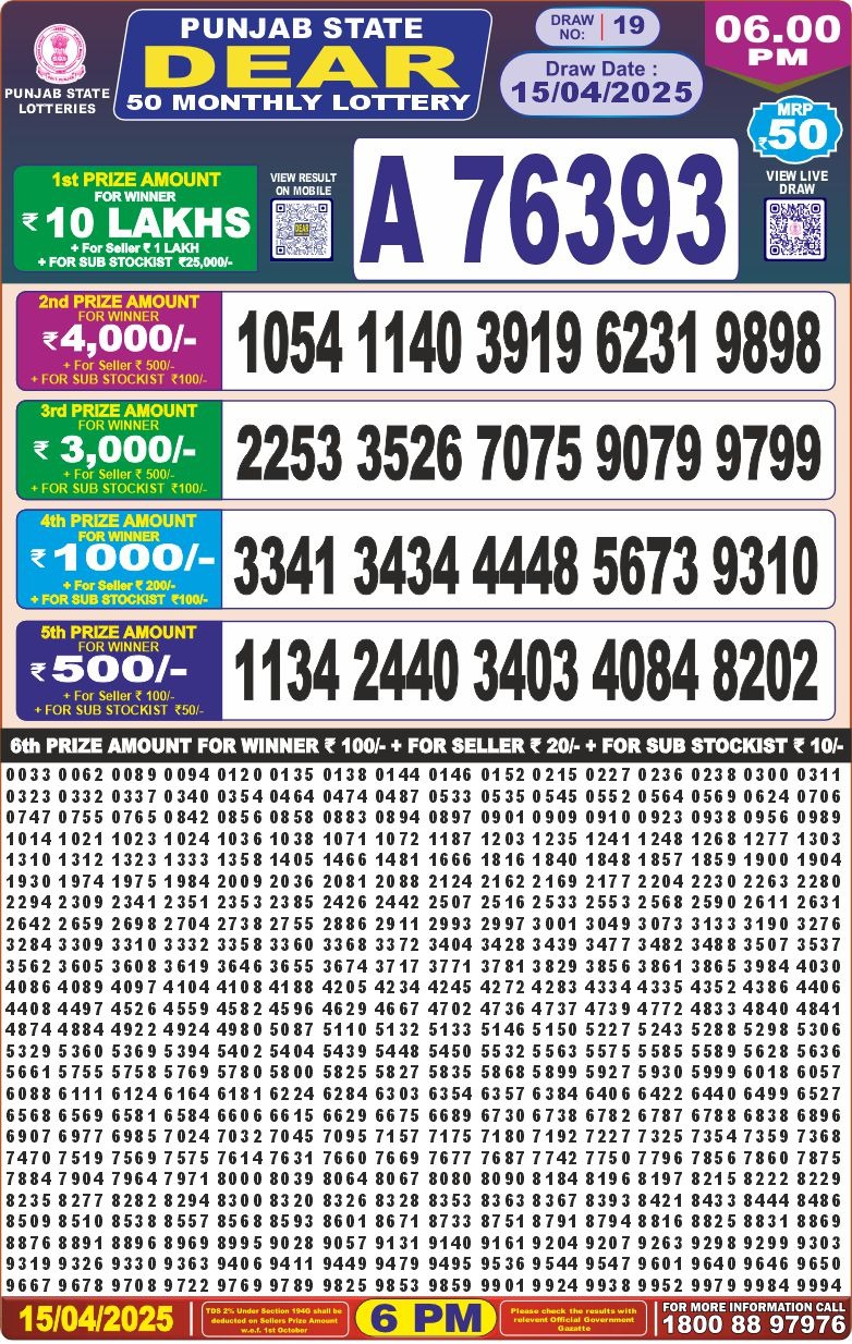Punjab state dear 50 monthly lottery result 15.4.25
