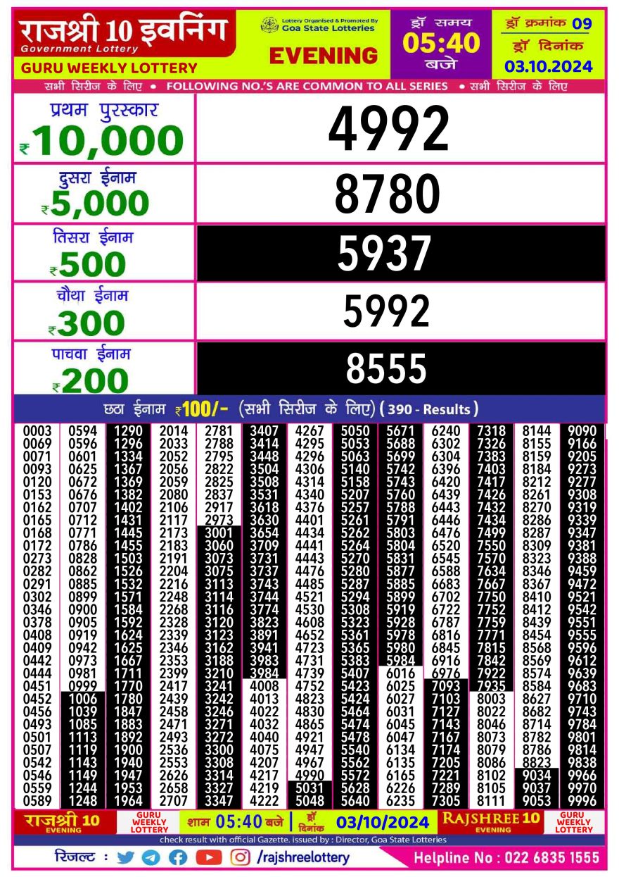 Rajshree 10 evening guru thursday  5:40pm result 3.10.24