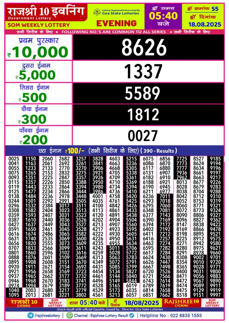 Rajshree 10 Evening Monday 5:40pm Result 18.08.2025