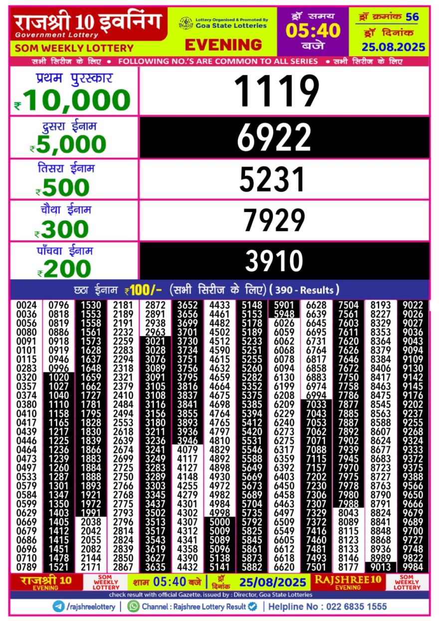Rajshree 10 Evening Monday 5:40pm Result 25.08.2025