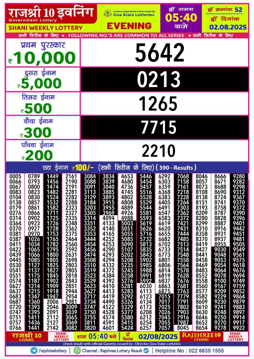 Rajshree 10 Evening Saturday 5:40pm Result 02.08.2025