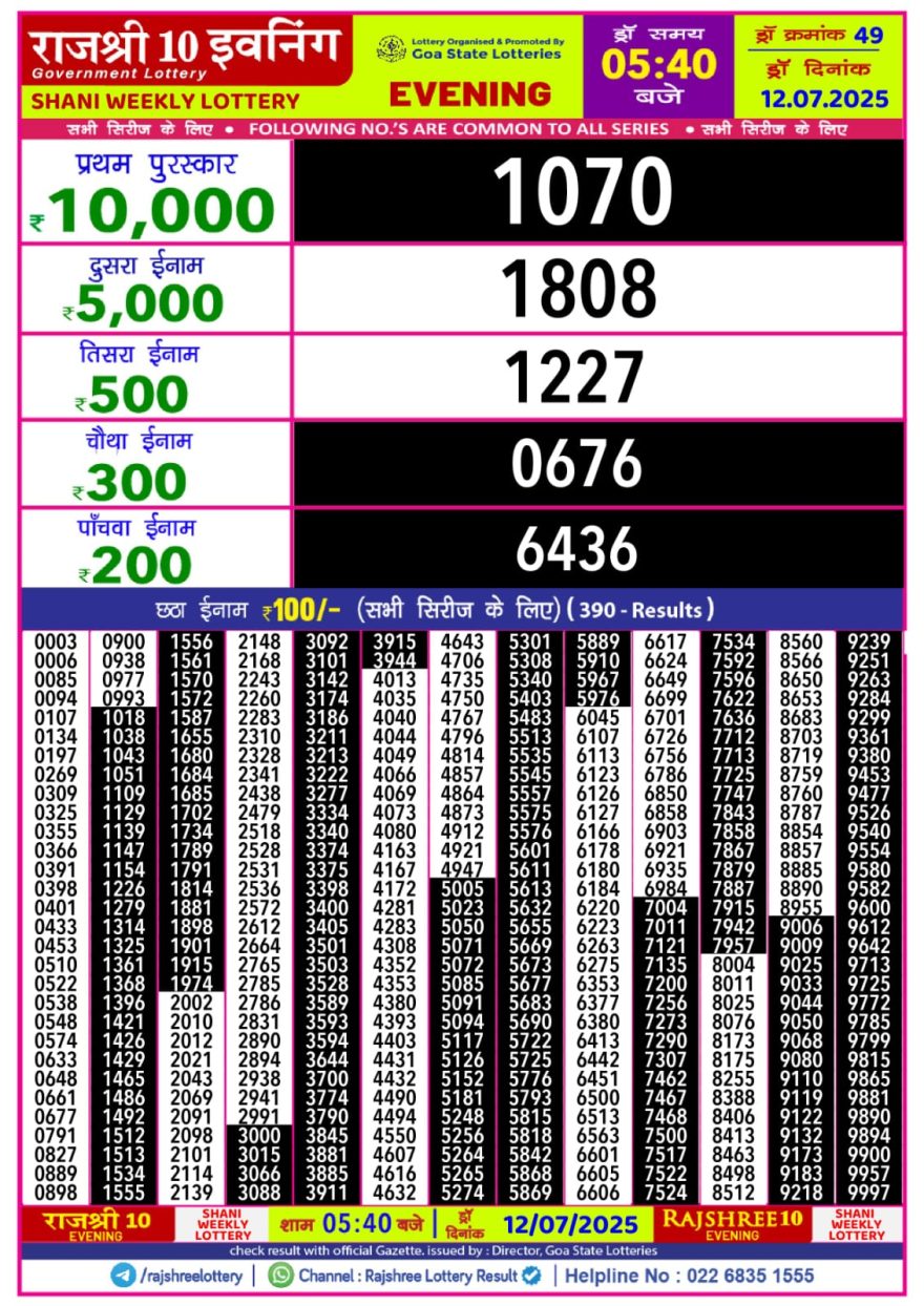 Rajshree 10 evening Saturday 5:40pm result 12.07.2025
