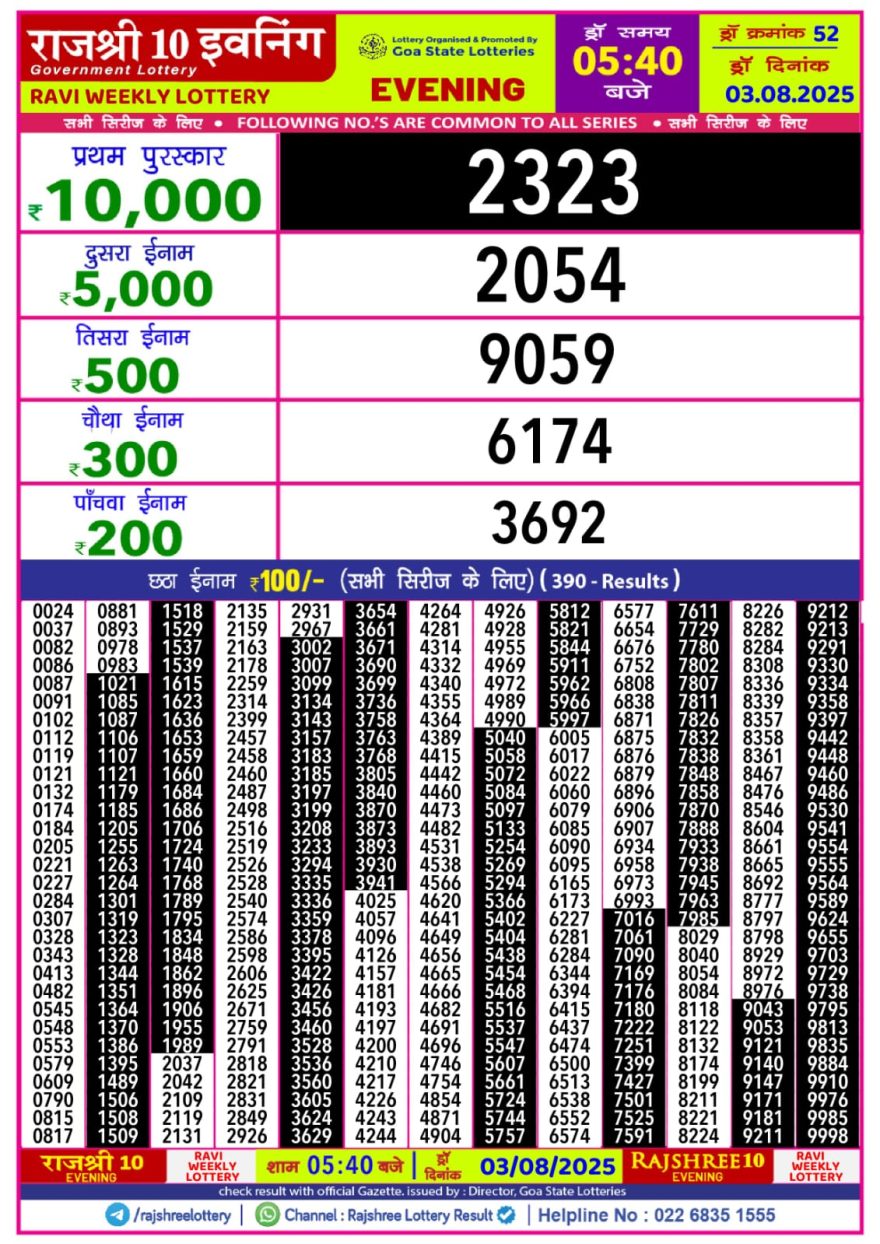 Rajshree 10 Evening Sunday 5:40pm Result 03.08.2025