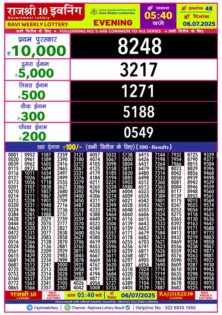 Rajshree 10 evening Sunday 5:40pm result 06.07.2025