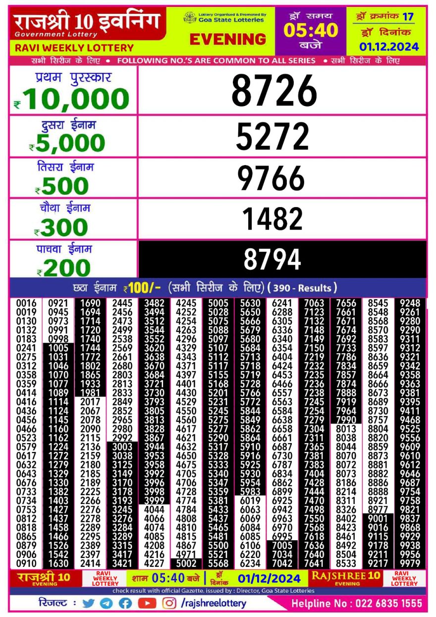 Rajshree 10 evening Sunday 5:40pm result 1.12.24