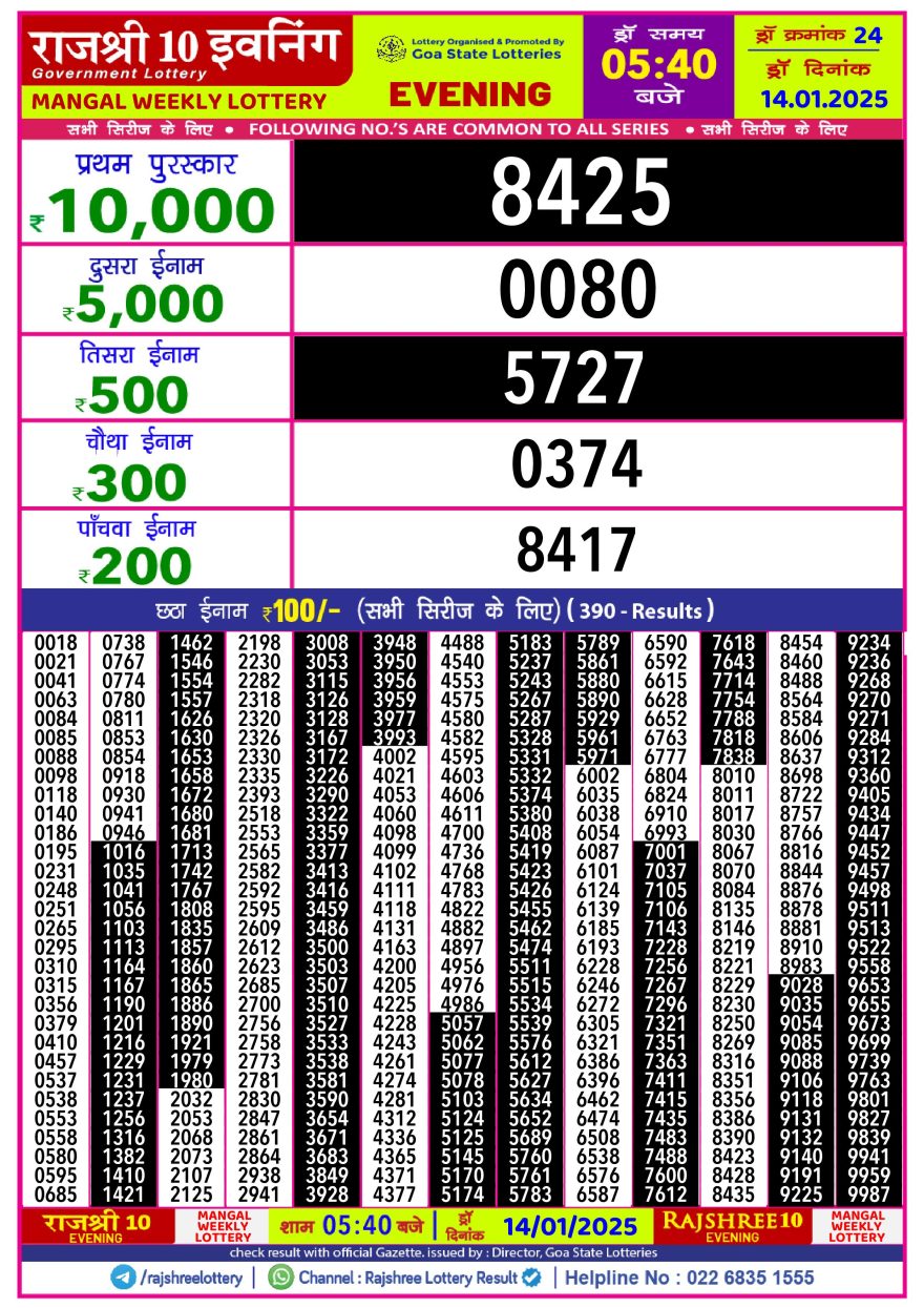 Rajshree 10 evening tuesday 5:40pm result 14.1.25