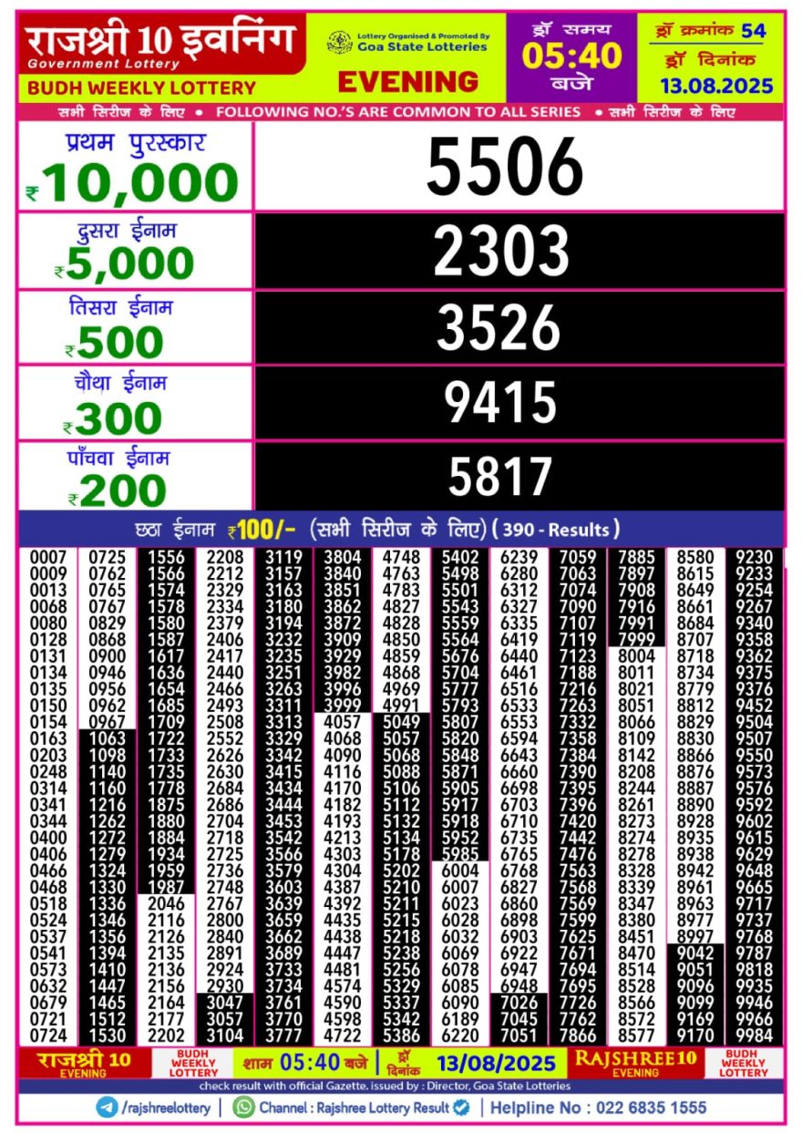 Rajshree 10 Evening Wednesday 5:40pm Lottery Result 13.08.2025