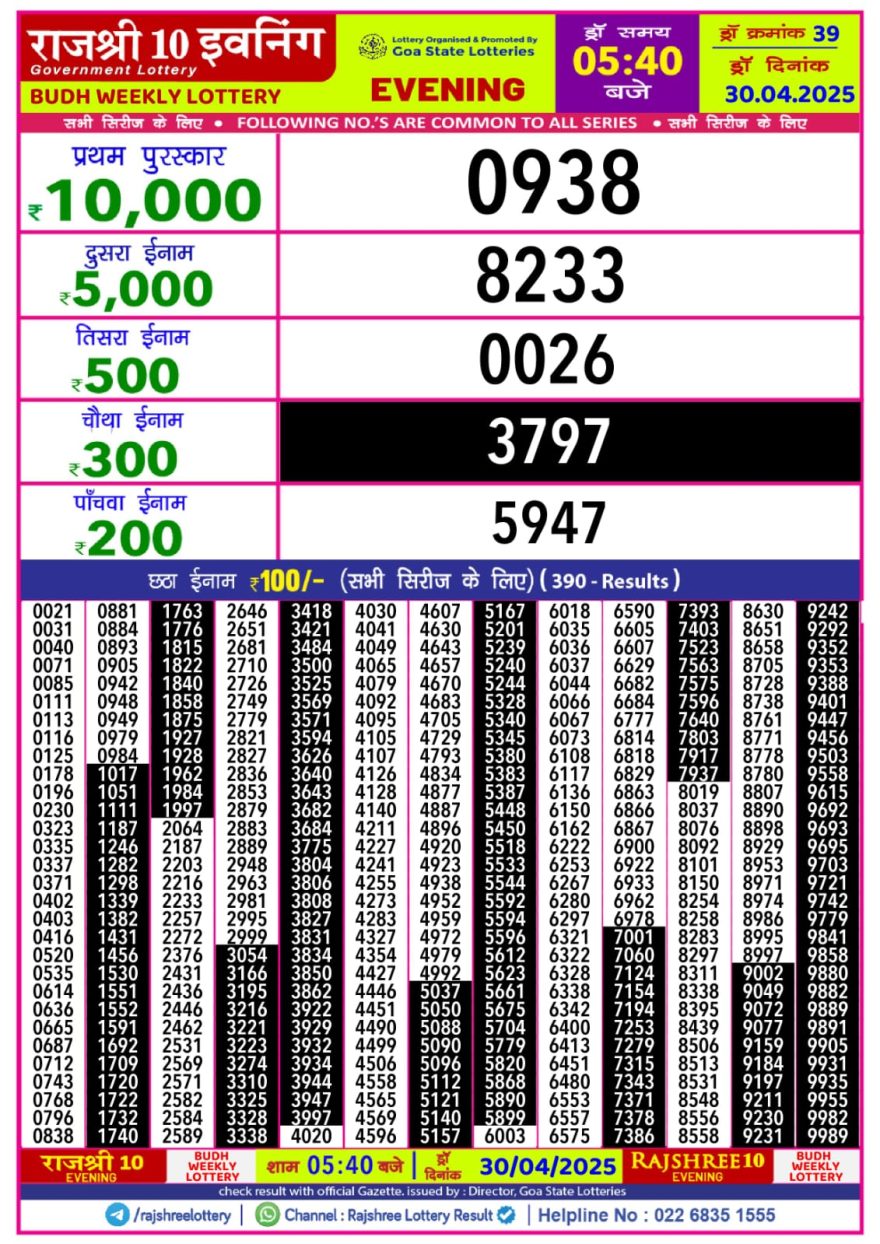Rajshree 10 evening Wednesday 5:40pm Lottery result 30.4.25