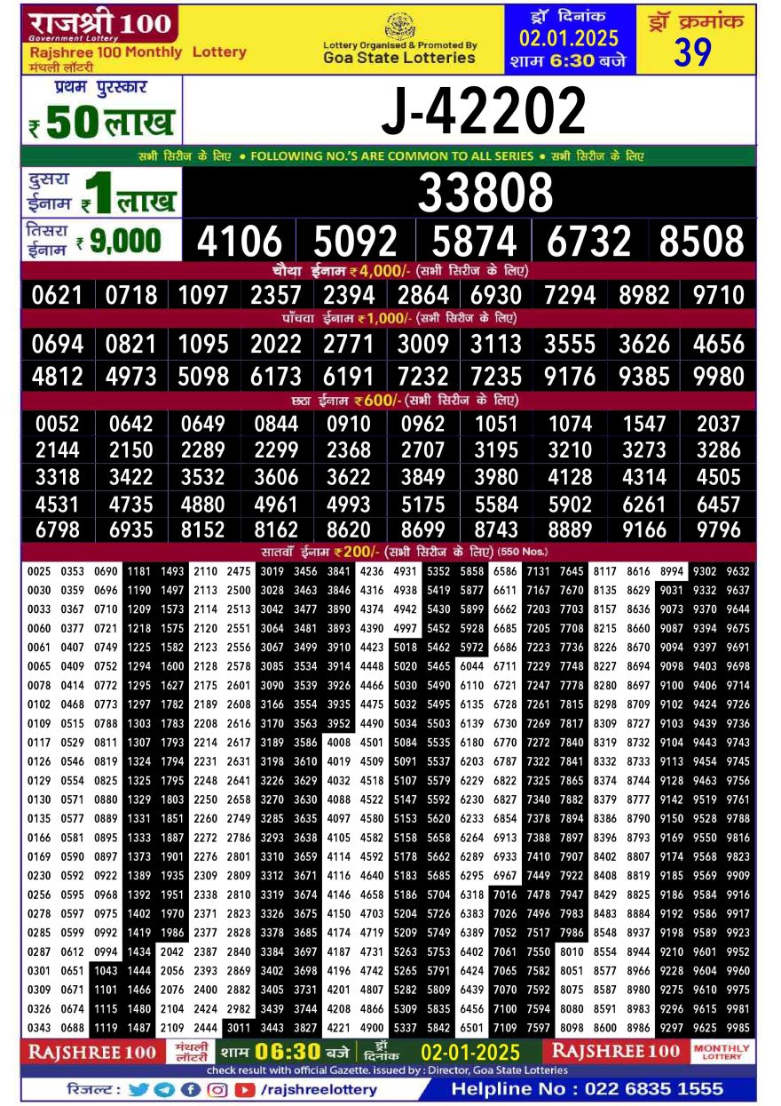 Rajshree 100 Monthly Lottery Result 6:30PM 2.1.2025