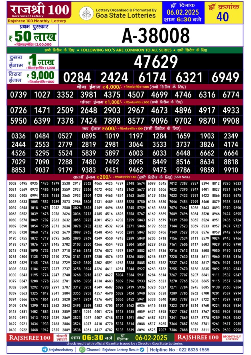 Rajshree 100 Monthly Lottery Result 6:30PM 6.2.2025