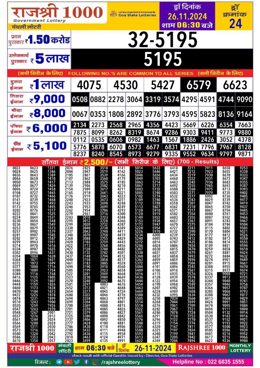 Rajshree 1000 Monthly Lottery Result 6.30 PM 26.11.2024