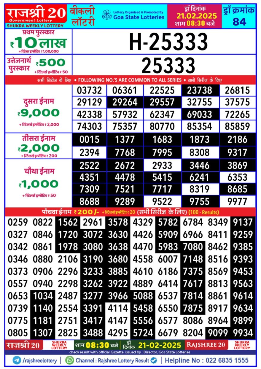 Rajshree 20 Lottery 8:30PM Result 21.2.2025