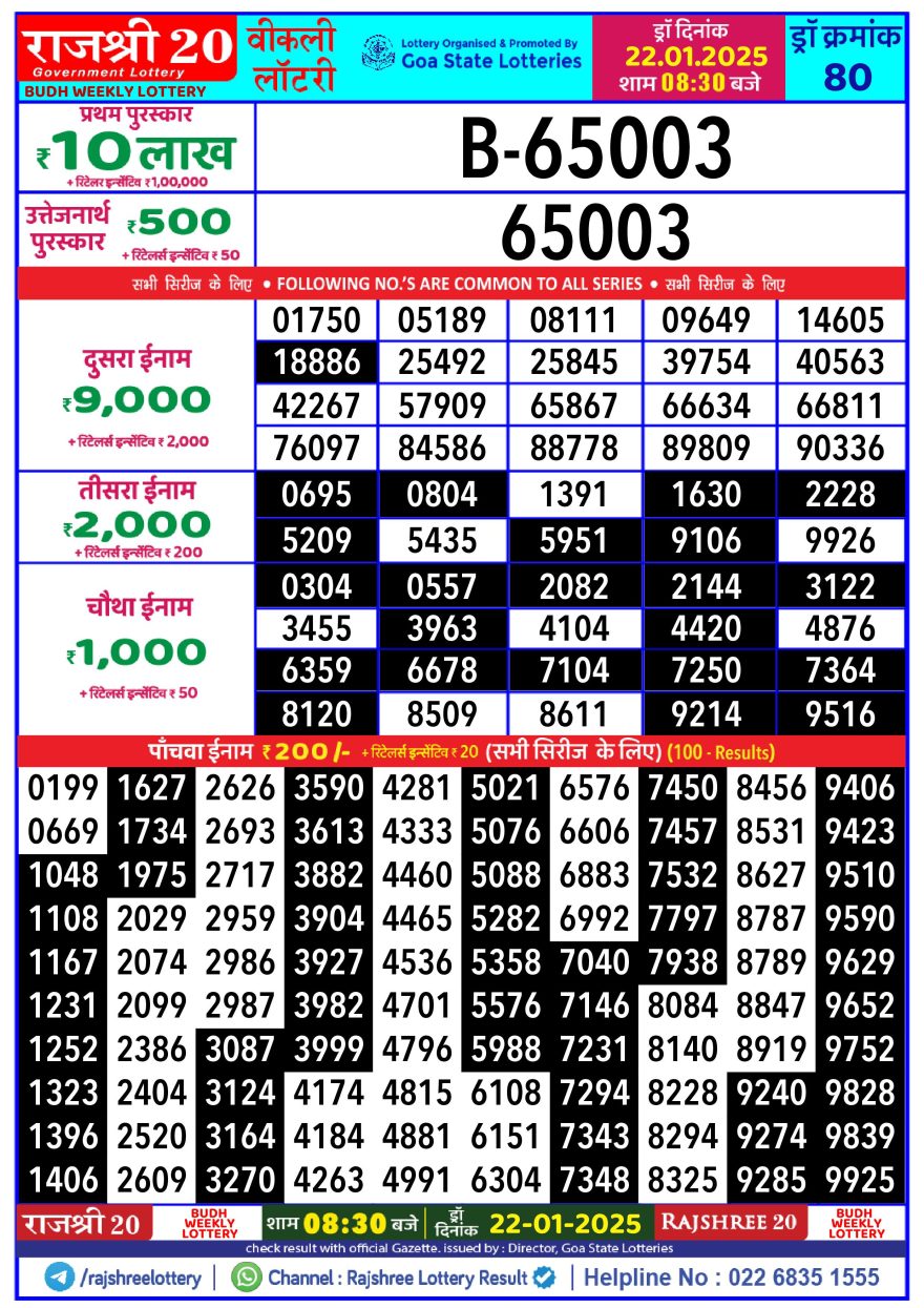Rajshree 20 Lottery 8:30PM Result 22.1.25
