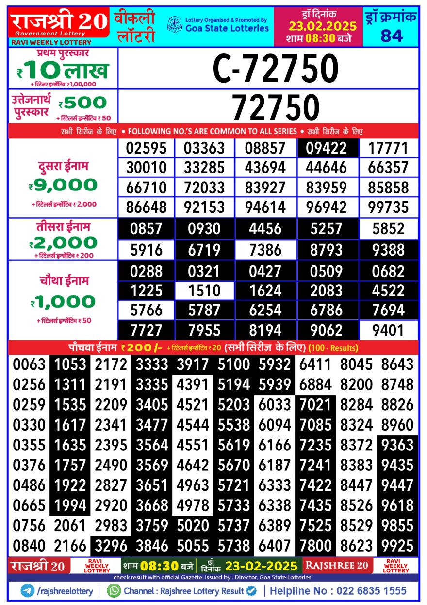 Rajshree 20 Lottery 8:30PM Result 23.2.2025