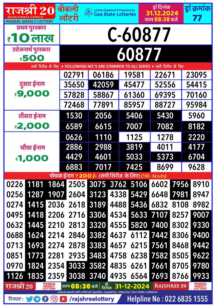Rajshree 20 Lottery 8:30PM Result 31.12.24