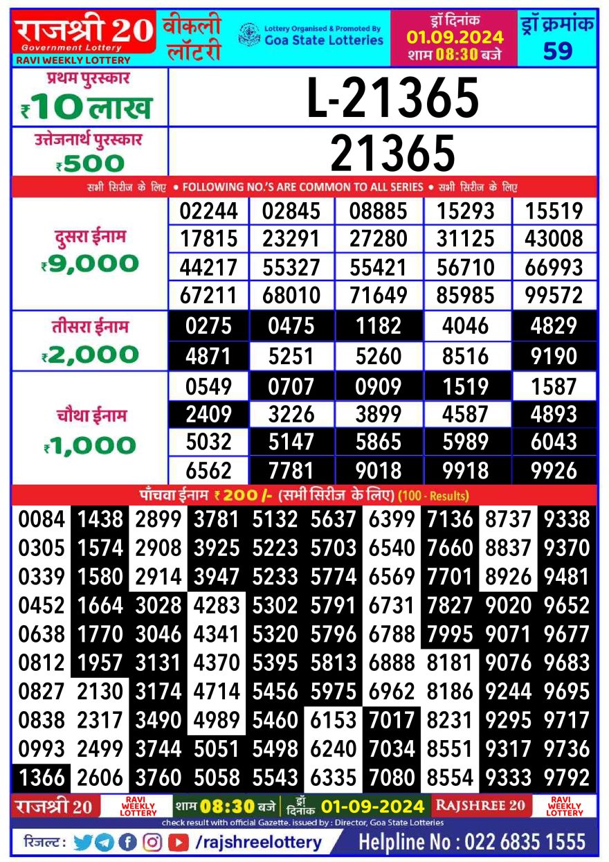 Rajshree 20  weekly 8:30pm Lottery result 1.09.24