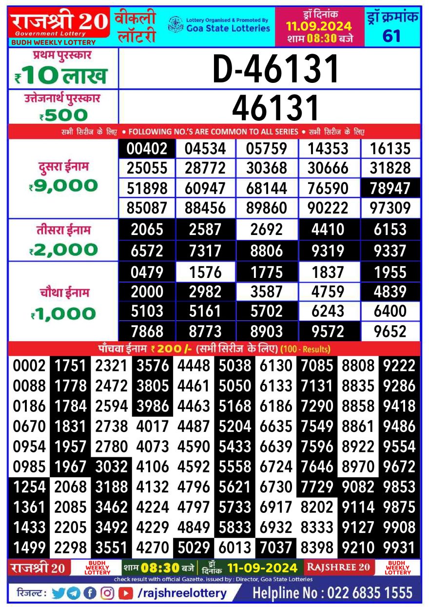 Rajshree 20  weekly 8:30pm Lottery result 11.09.24