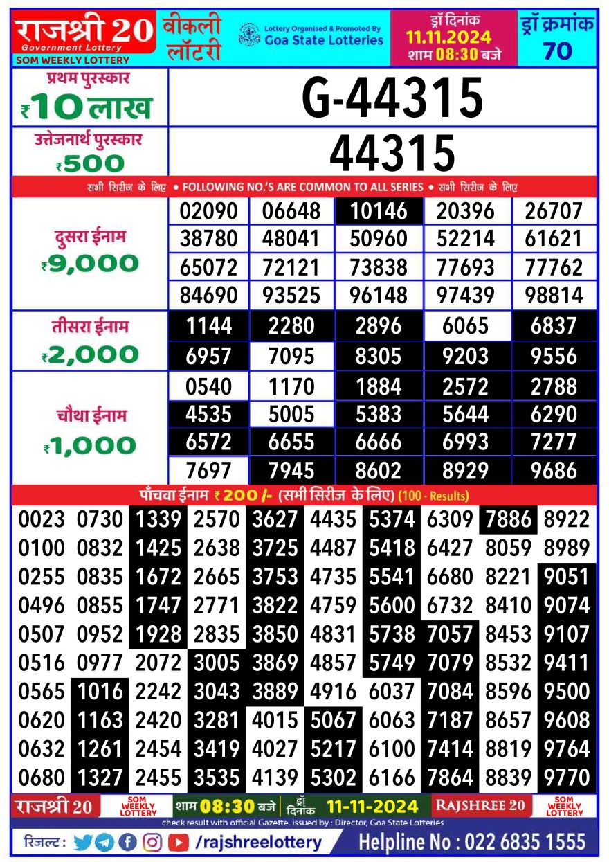 Rajshree 20  weekly 8:30pm Lottery result 11.11.24