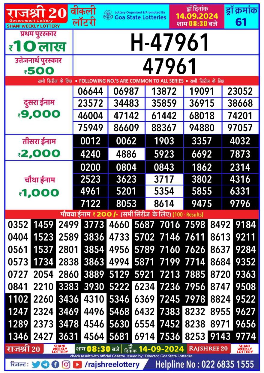 Rajshree 20  weekly 8:30pm Lottery result 14.09.24