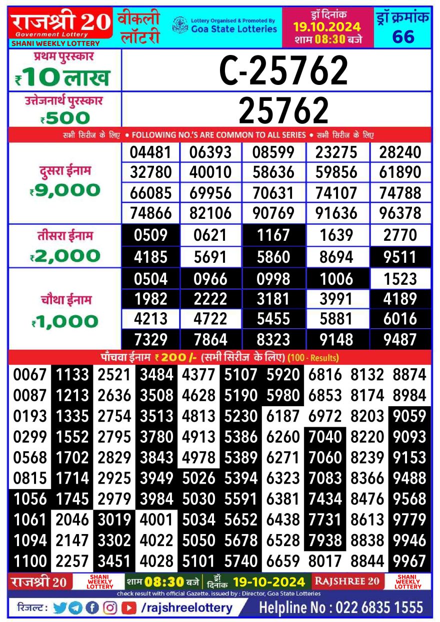 Rajshree 20  weekly 8:30pm Lottery result 19.10.24