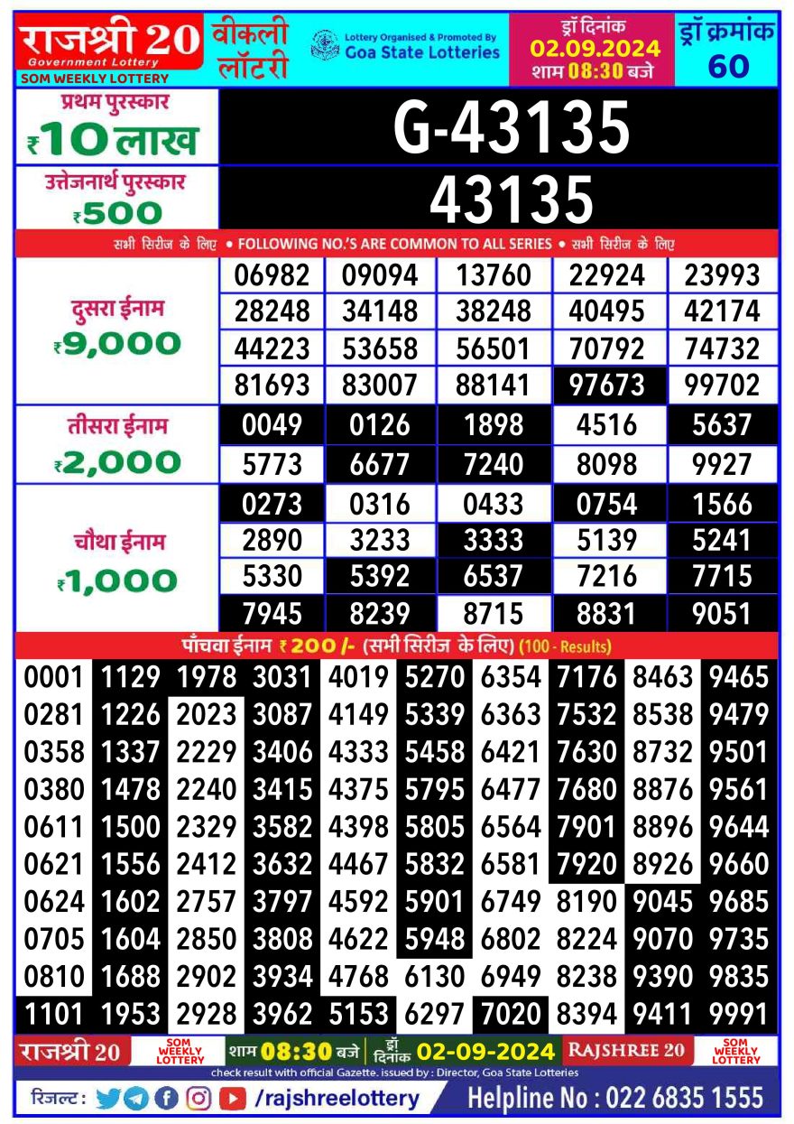 Rajshree 20  weekly 8:30pm Lottery result 2.09.24