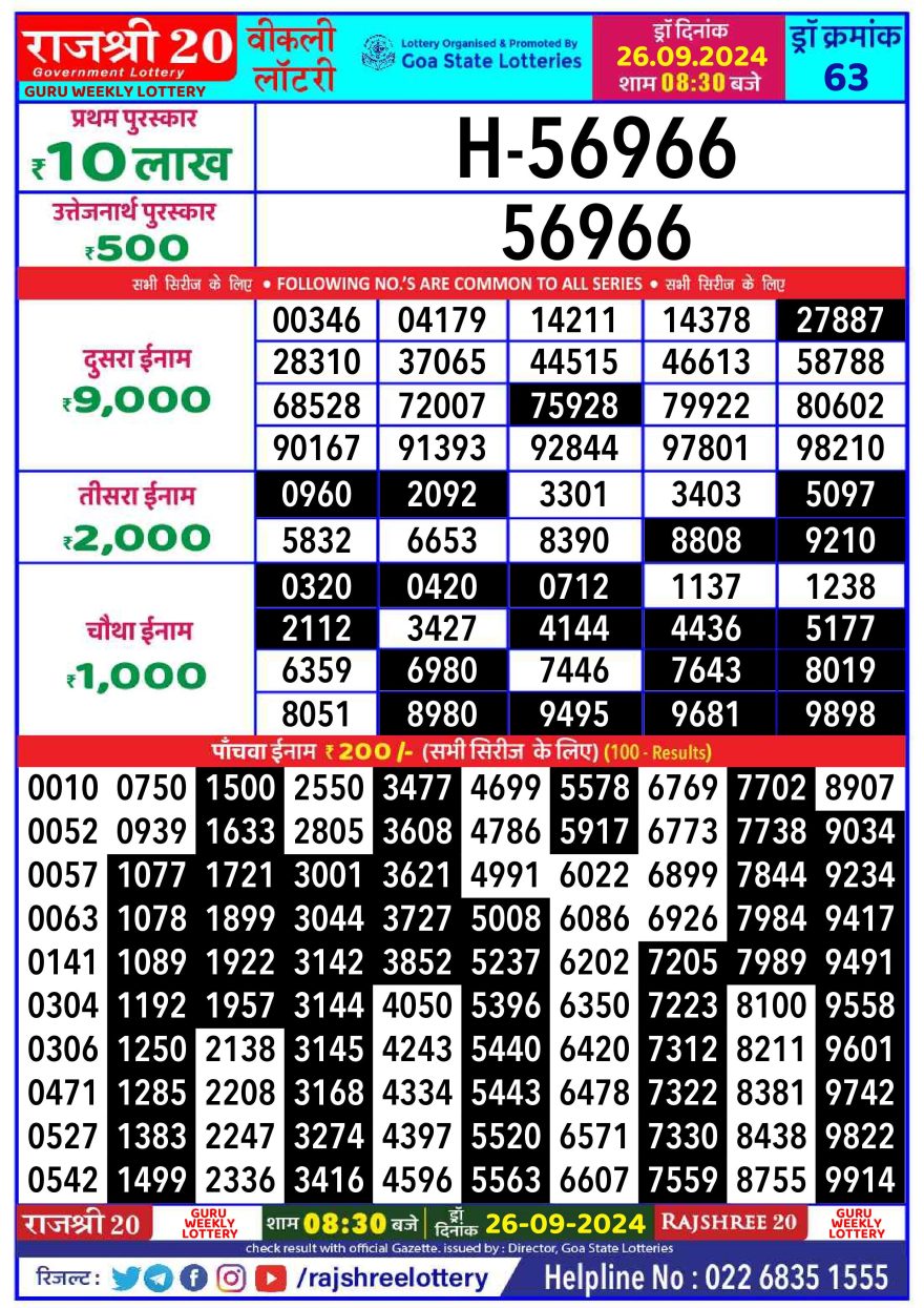 Rajshree 20  weekly 8:30pm Lottery result 26.09.24