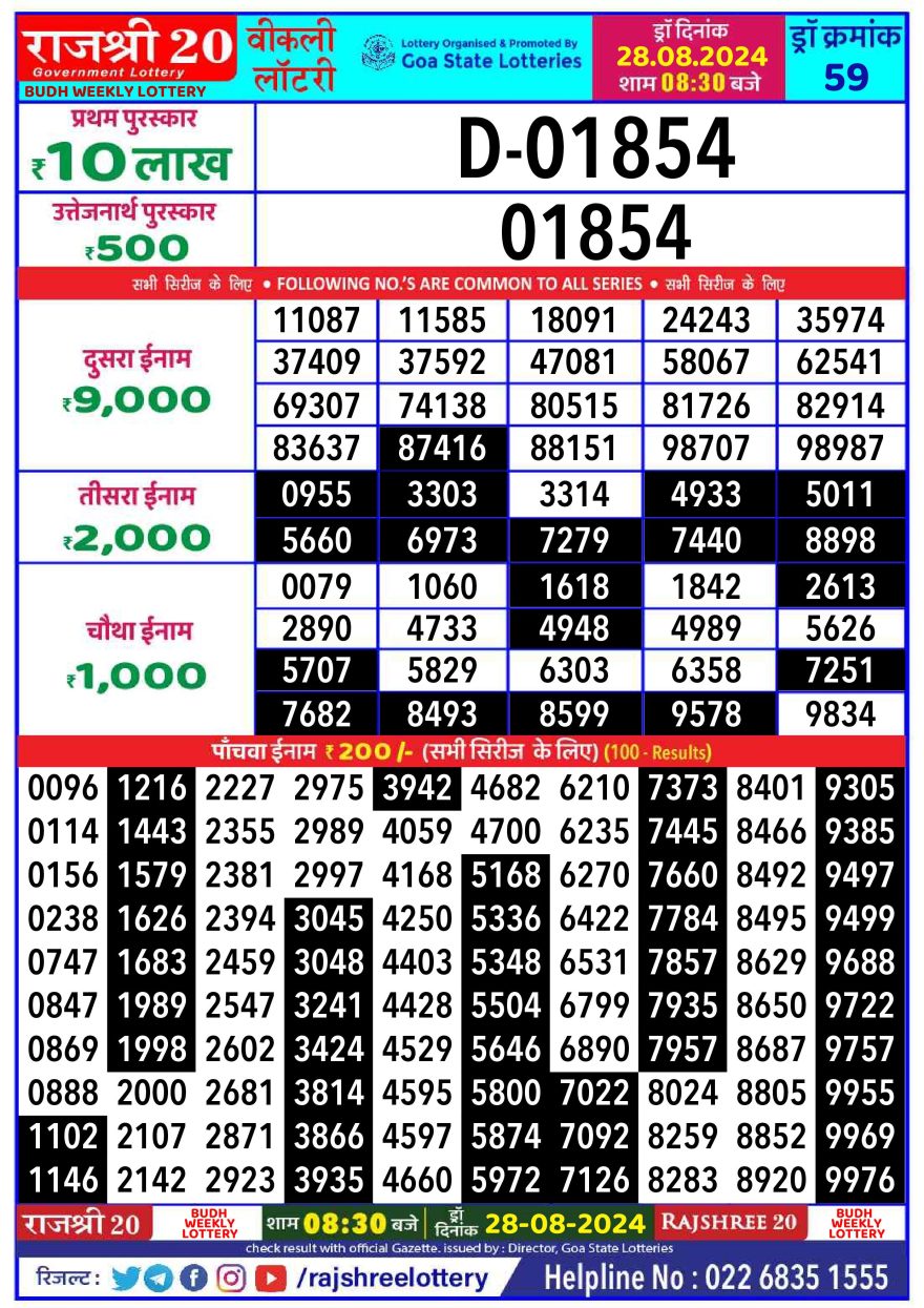 Rajshree 20  weekly 8:30pm Lottery result 28.08.24