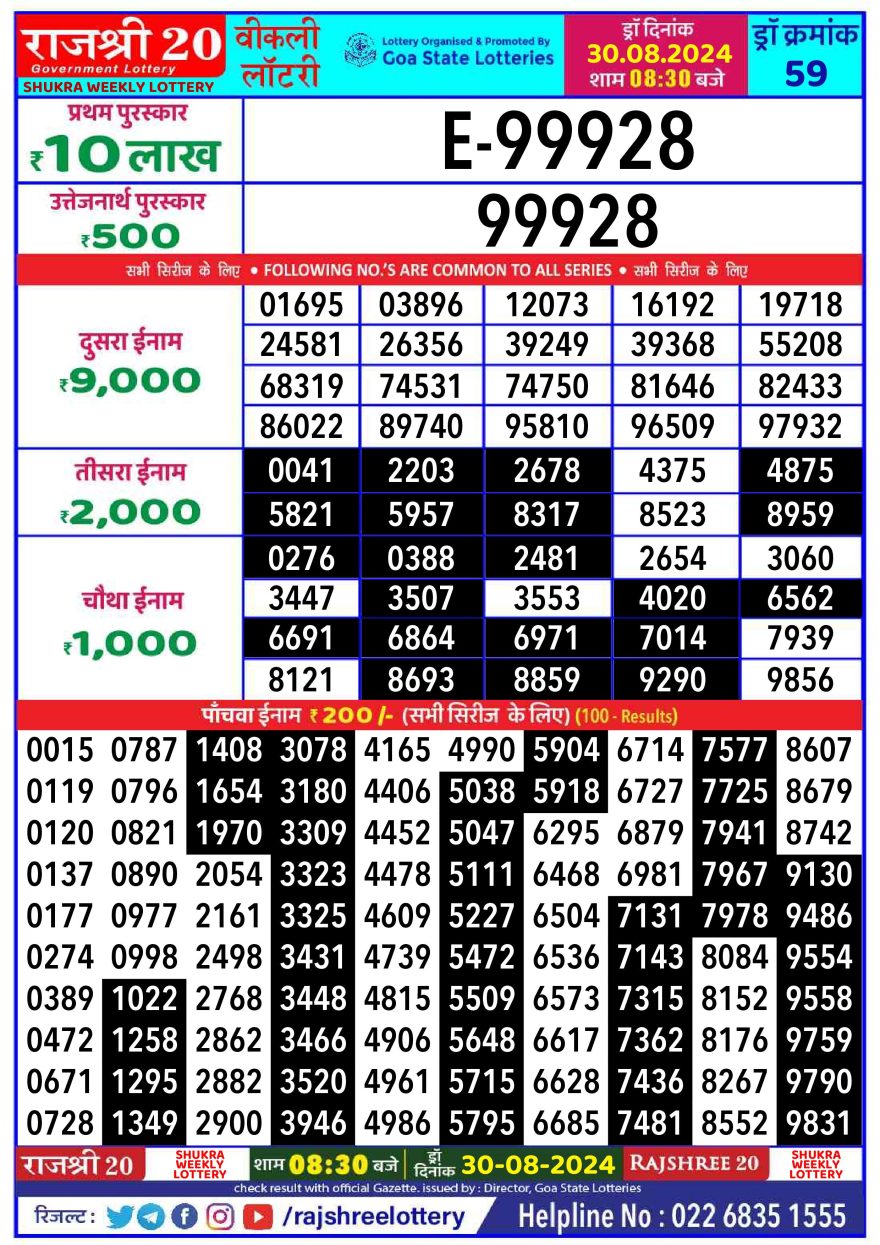 Rajshree 20  weekly 8:30pm Lottery result 30.08.24