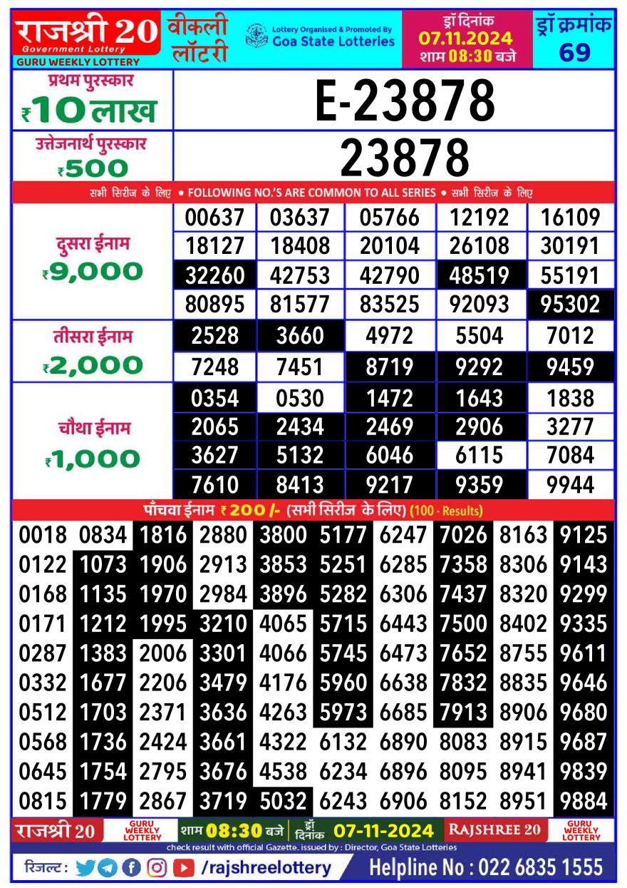 Rajshree 20  weekly 8:30pm Lottery result 7.11.24