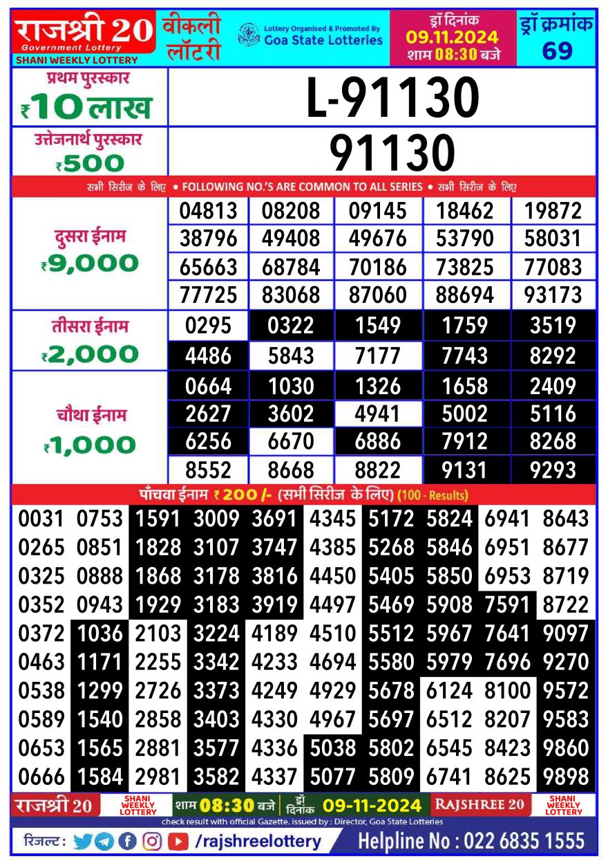 Rajshree 20  weekly 8:30pm Lottery result 9.11.24