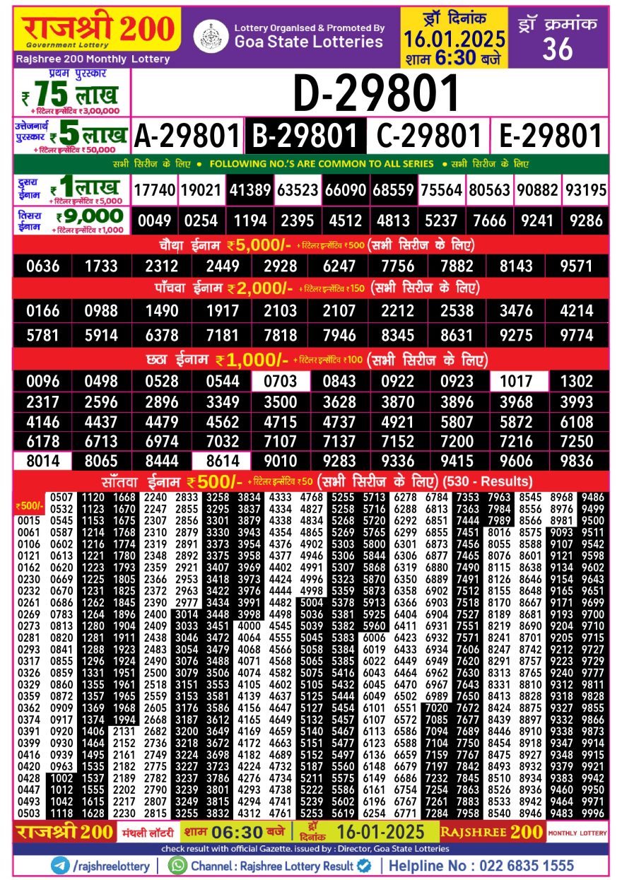 Rajshree 200 Monthly Lottery Result 6:30PM 16.1.2025
