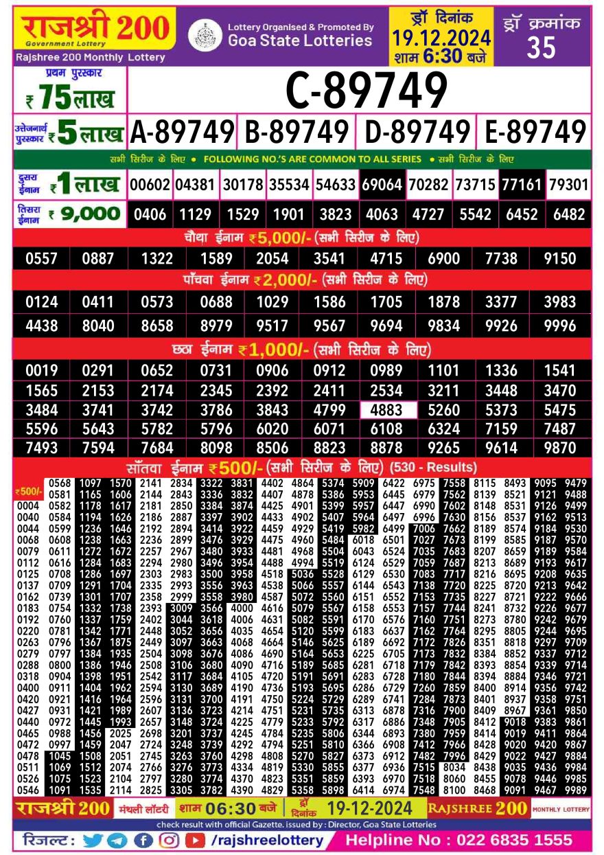 Rajshree 200 Monthly Lottery Result 6:30PM 19.12.2024