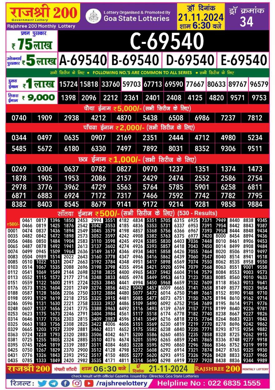 Rajshree 200 Monthly Lottery Result 6:30PM 21.11.2024