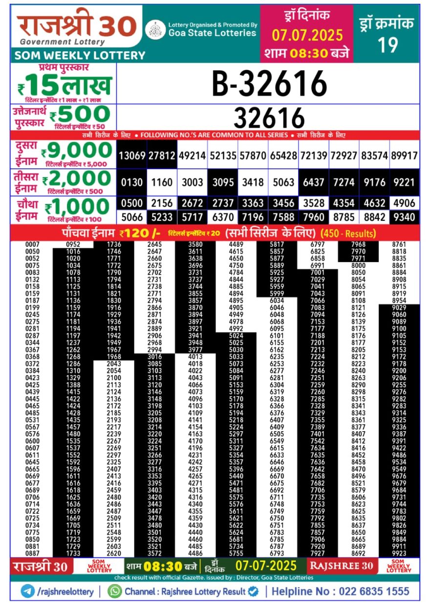 Rajshree 30 Lottery 8:30PM Result 07.07.2025