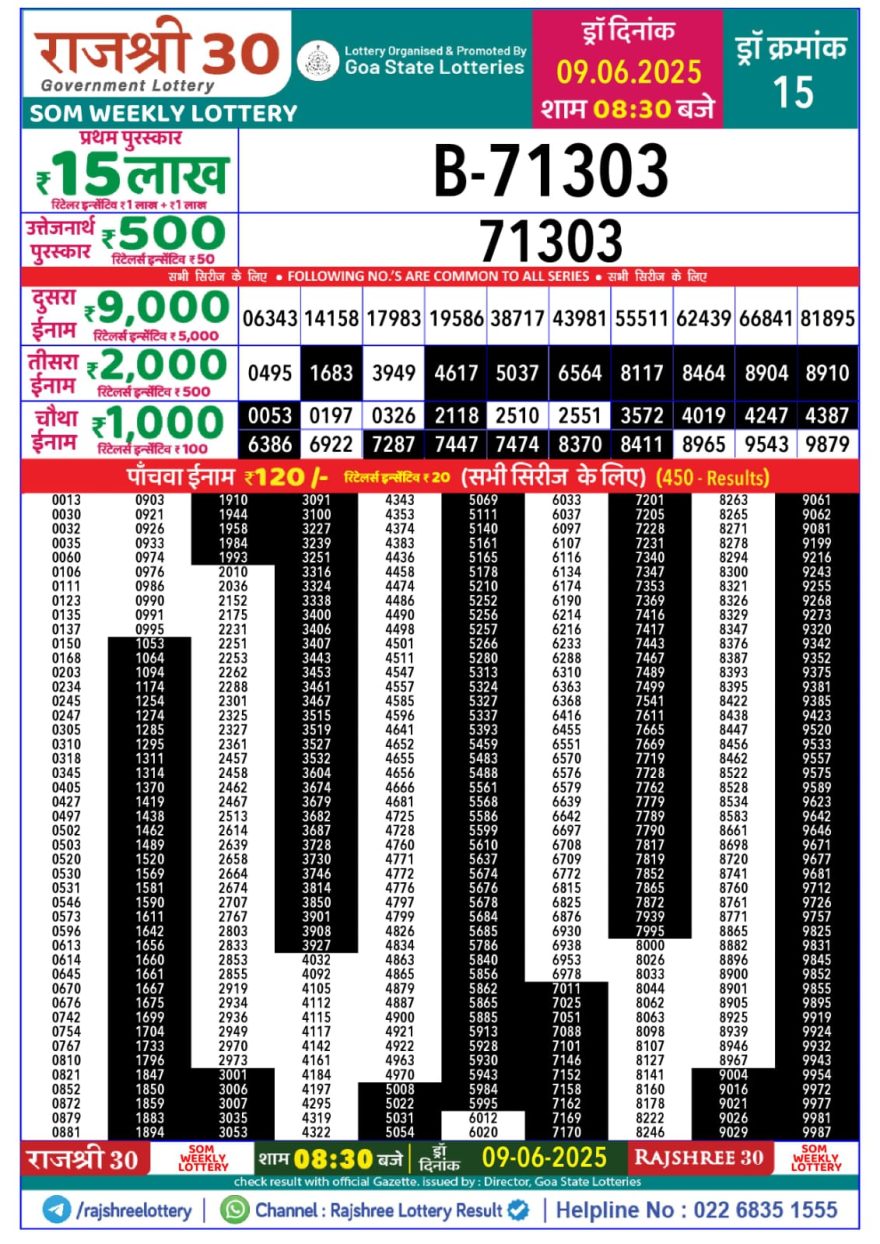 Rajshree 30 Lottery 8:30PM Result 09.06.2025