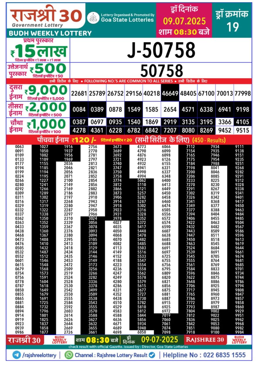Rajshree 30 Lottery 8:30PM Result 09.07.2025