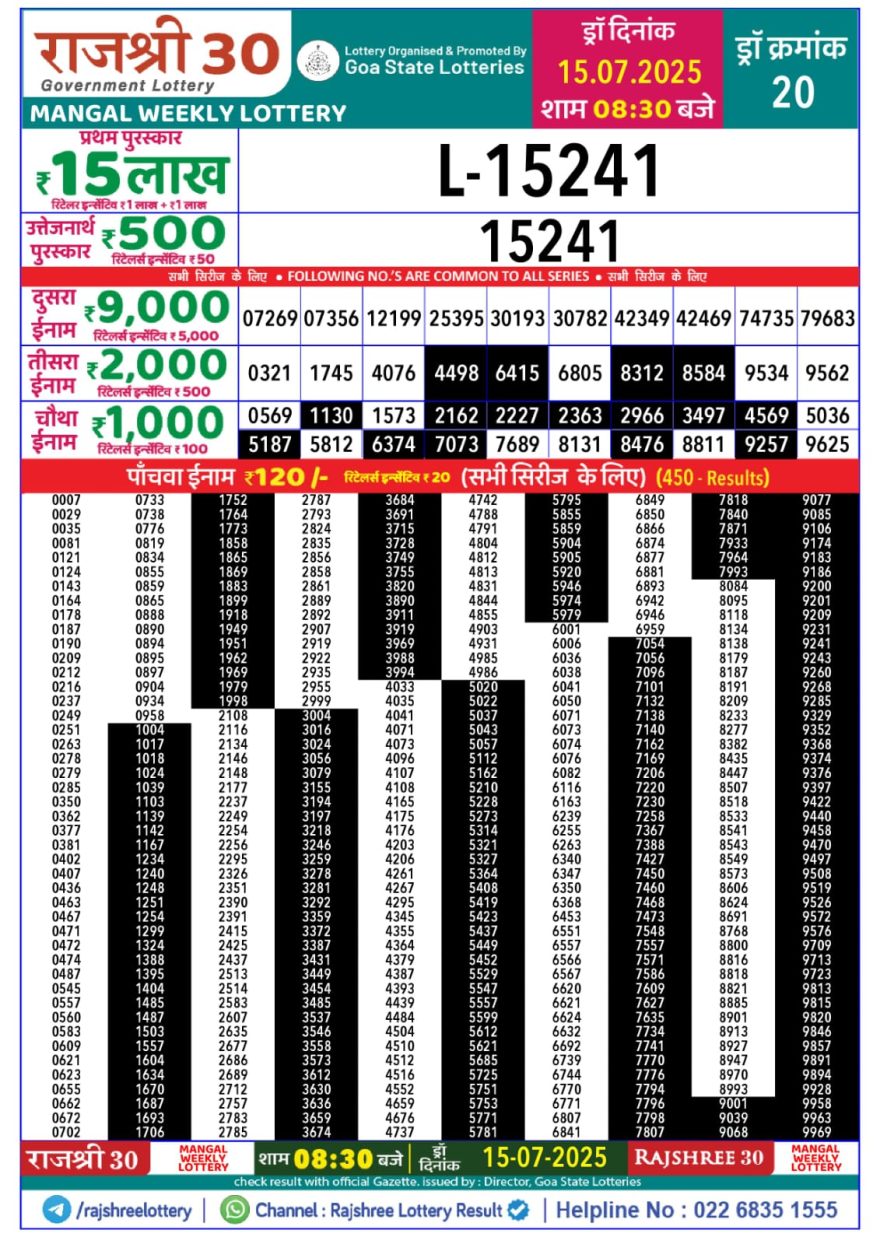 Rajshree 30 Lottery 8:30PM Result 15.07.2025