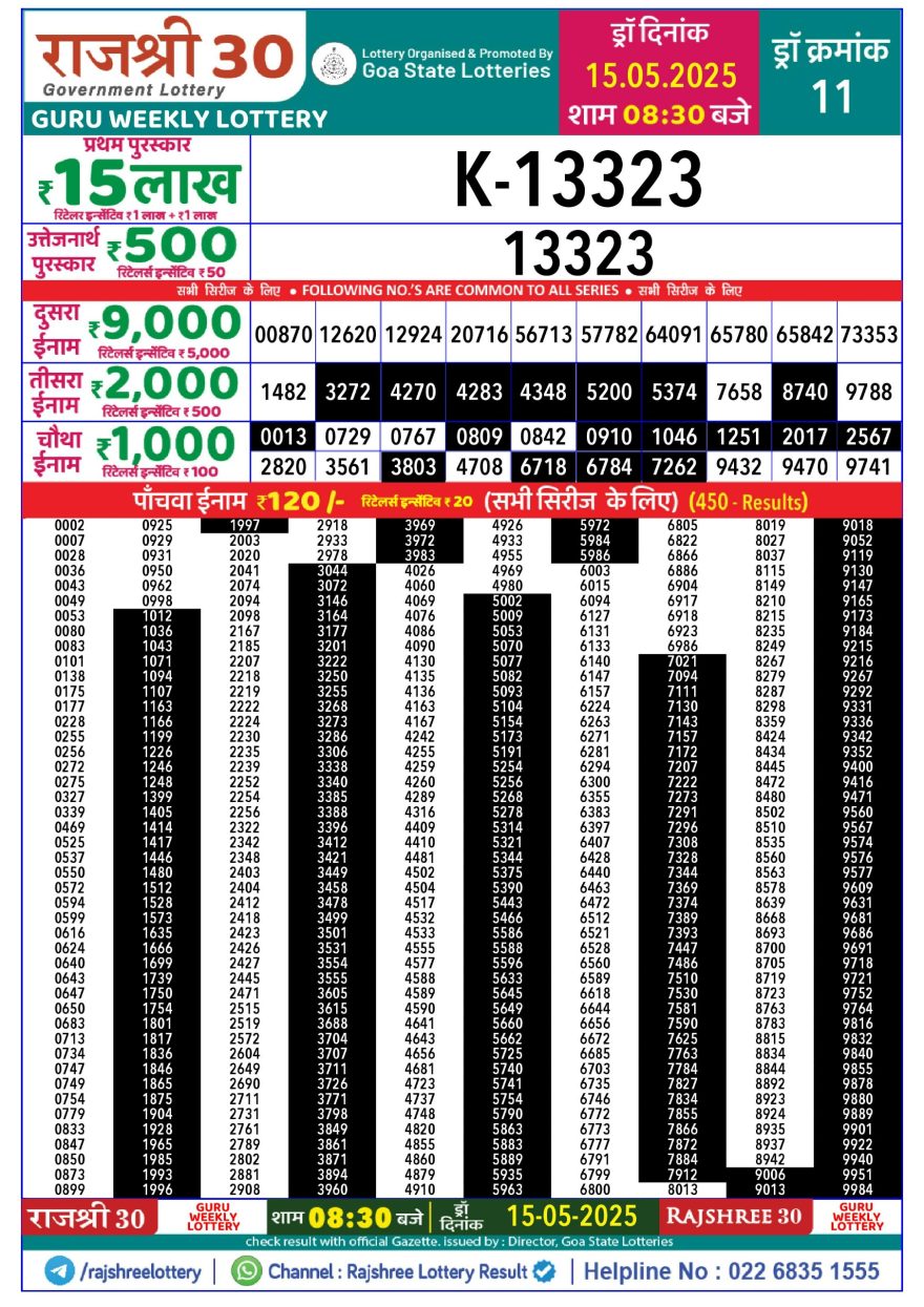 Rajshree 30 Lottery 8:30PM Result 15.5.2025