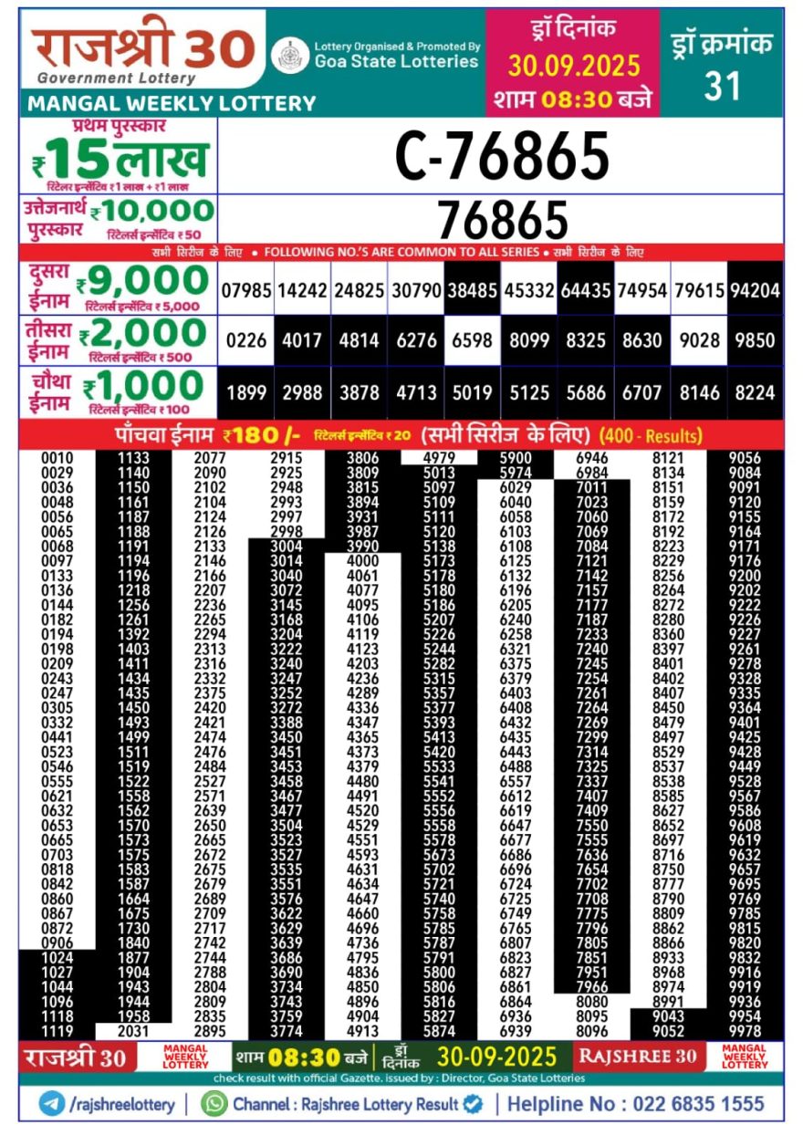 Rajshree 30 Lottery 8:30pm Result 30.09.2025