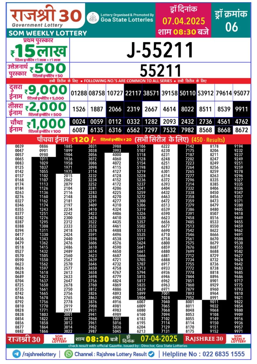 Rajshree 30 Lottery 8:30PM Result 7.4.25