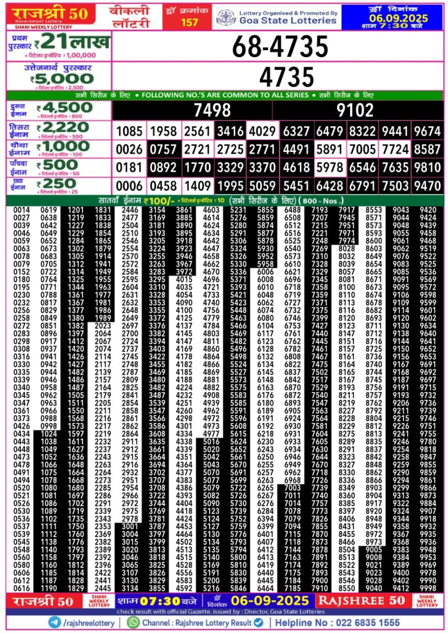Rajshree 50 Lottery 7:30pm Result 06.09.2025