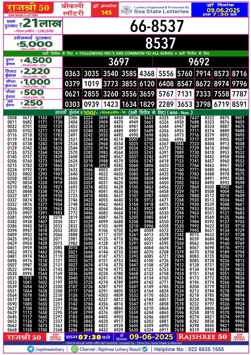Rajshree 50 Lottery 7:30PM Result 09.06.2025