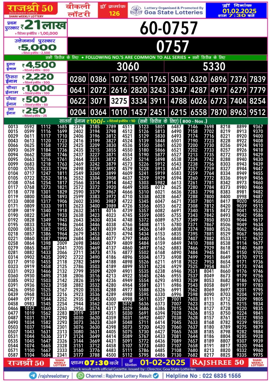 Rajshree 50 Lottery 7:30PM Result 1.2.2025