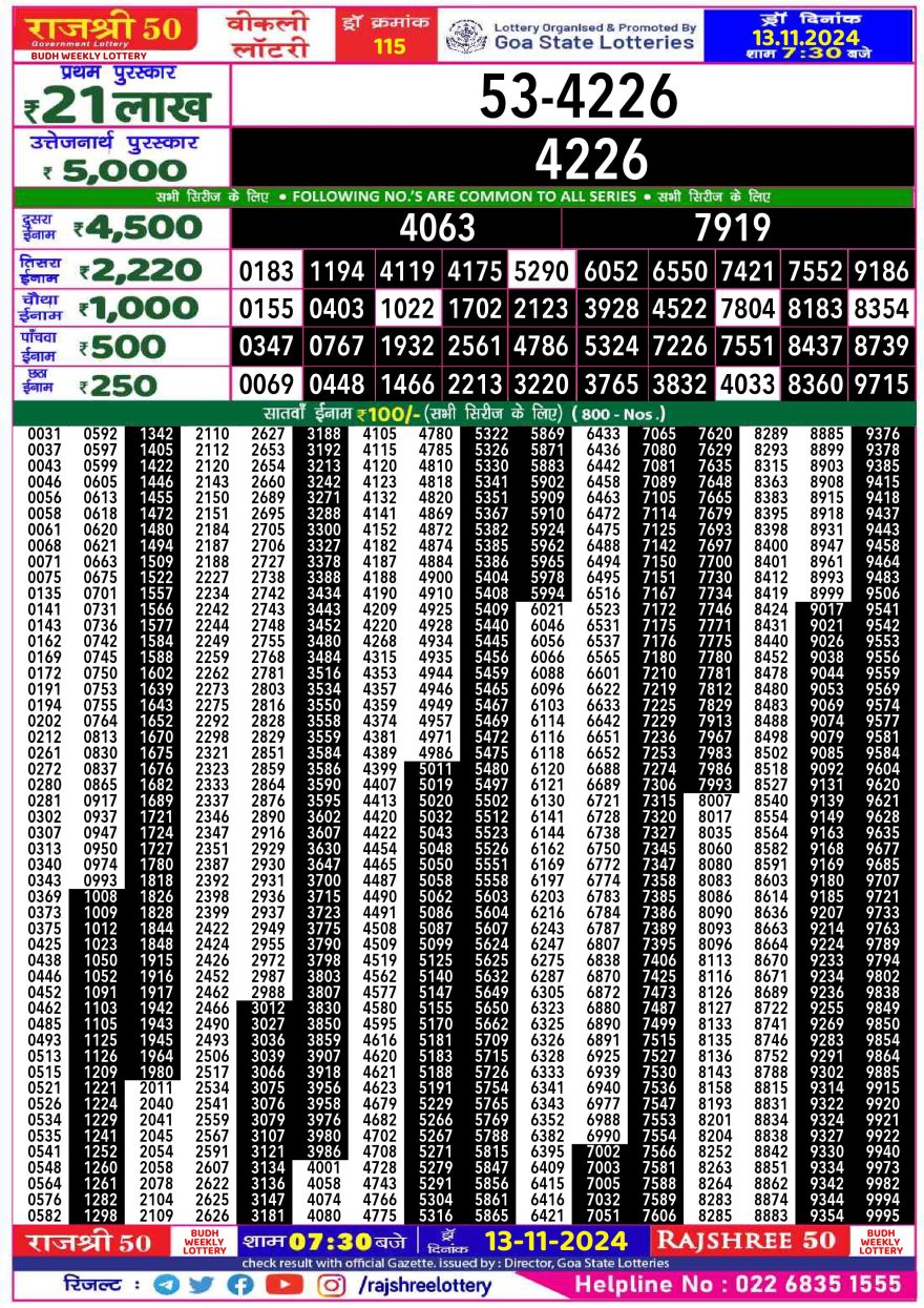 Rajshree 50  Lottery 7:30PM Result 13.11.24