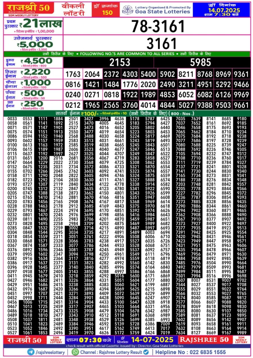 Rajshree 50 Lottery 7:30PM Result 14.07.2025