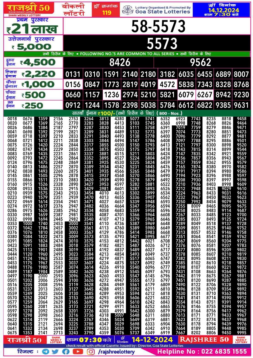 Rajshree 50 Lottery 7:30PM Result 14.12.24