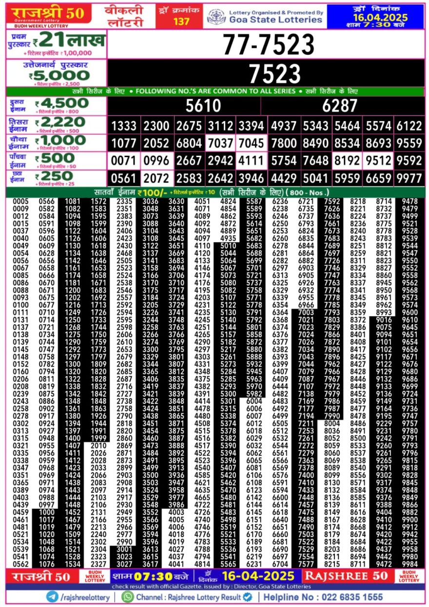 Rajshree 50 Lottery 7:30PM Result 16.4.25